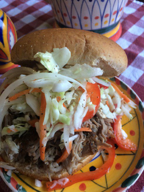 - Remove cooked pork from slow cooker and shred, using 2 forks. Return shredded pork to the juices in the slow cooker. Portion pork onto buns and top with a large helping of coleslaw. Enjoy!