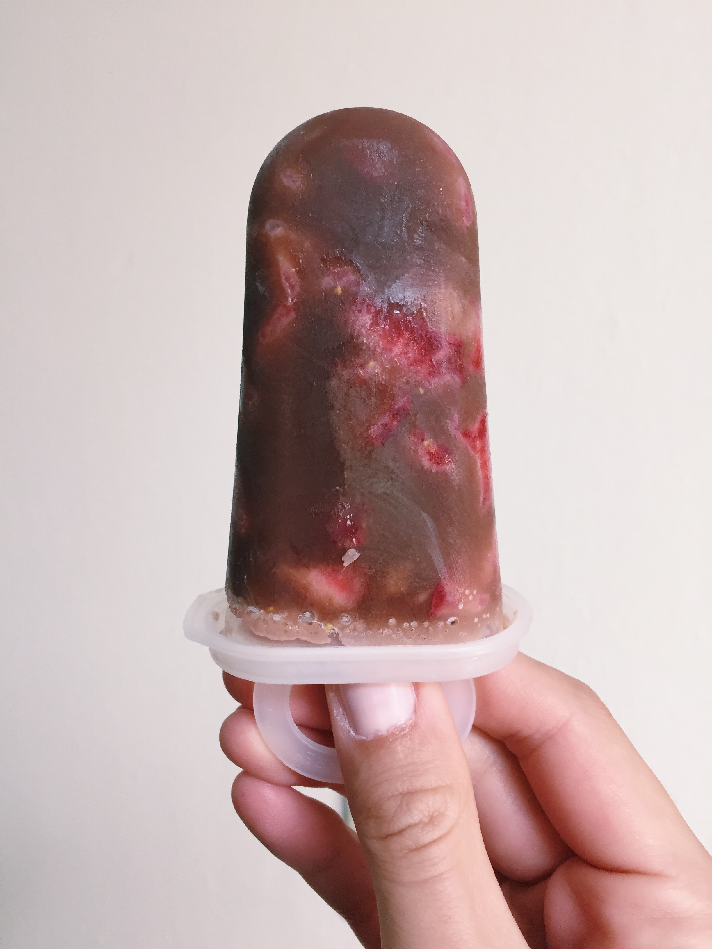 - Spoon the strawberry mixture into the popsicle molds and pour in chocolate milk until it reaches the top. Place on the lid and push the popsicle sticks into the slots.