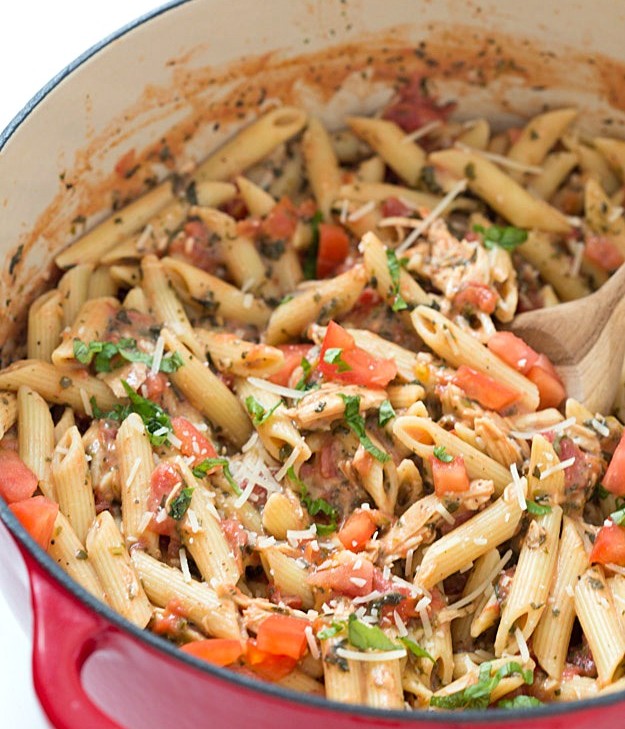 - Add cooked pasta to sauce and stir gently to combine. Remove from heat and serve. Garnish with diced tomatoes, fresh basil, and Parmesan cheese; if desired.