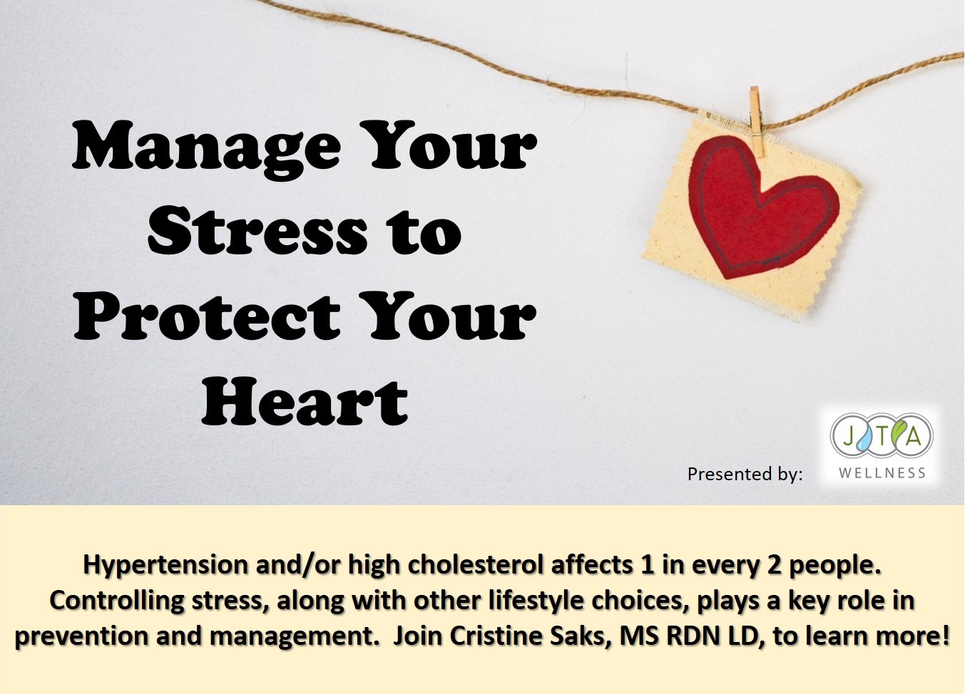 Cardiovascular disease (CVD) is on the rise. CVD, which includes hypertension and high cholesterol, affects 1 in every 2 people. Controlling stress, along with other lifestyle choices, plays a key role in prevention and management. Come learn powerful strategies and stress-busting recipes to avoid or control CVD!