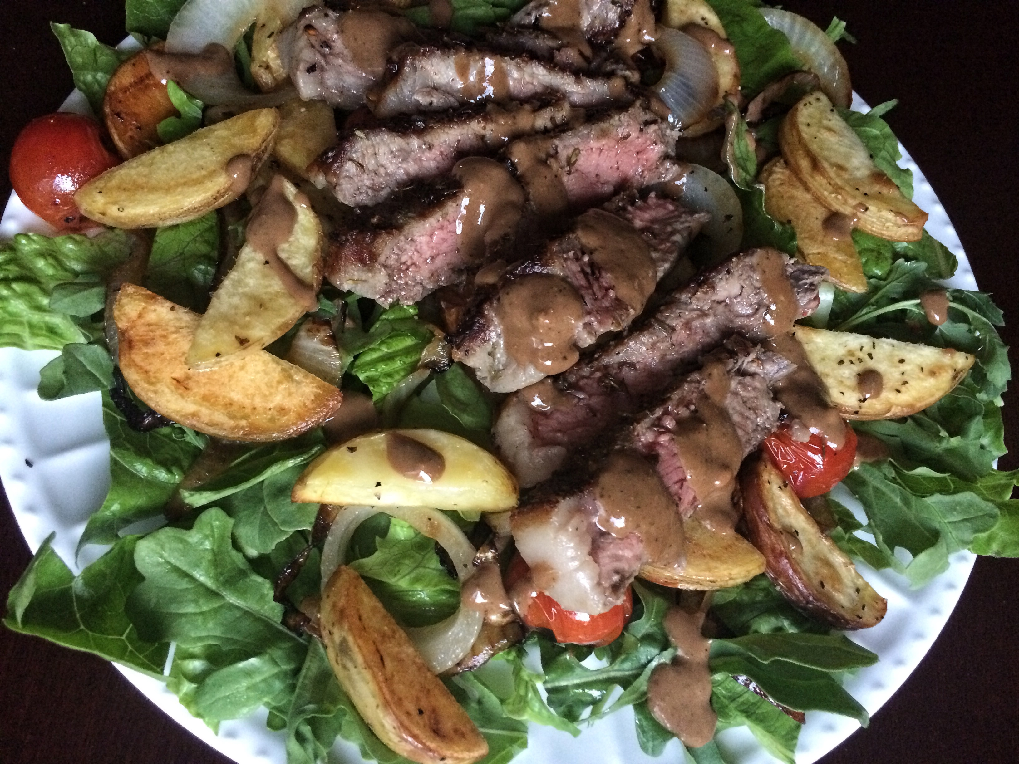 JTA Wellness2016-11-04T06:25:42-06:00Grilled Steak and Potatoes Salad Nutrition Information Serves: 4 salads Calories: 420 Fat: 13 g Carbohydrates: 41 g Sodium: 400 mg Fiber: 5 g Protein: 35 g Cholesterol: 75 mg Type: Entree Prep Time: 10 mins Cook Time: 20 mins Total Time: 30 mins
